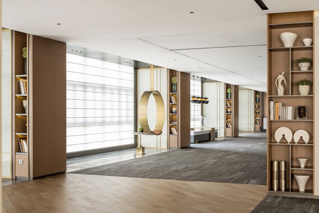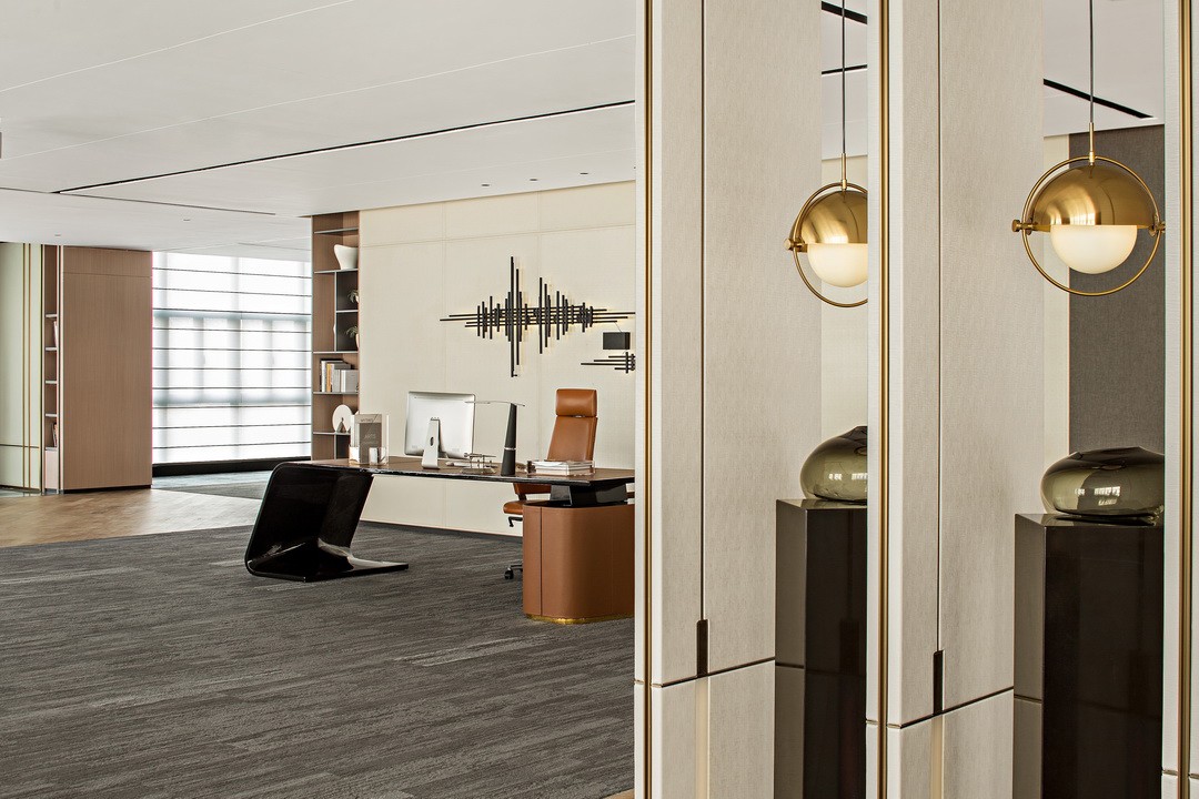 The internal office area pays more attention to comfort and efficiency than the outdoor hall. The carpet has the function of silencer. The use of glass and wooden lampposts enhances the atmosphere and life. The entire space is laid on the basis of not affecting the vision outside the window. Open, so that business operations are efficient, cultural connotation, and wealth value can complement each other.