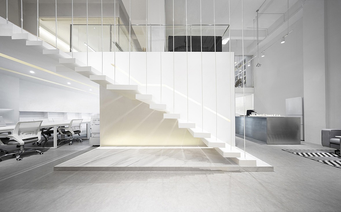 Choose "white" and "grey" as the main colors to realize the simple atmosphere and sense of science and technology in the public space. In addition to creating certain visual stimulation and reducing visual fatigue, it is also an effective way to indirectly convey corporate culture and form a bond between space and culture. The meeting room space constructed with polyhedrons and special-shaped geometry shapes the company's spirit of breaking the convention and being brave to innovate. The interaction between design, space and furniture is the key to office space design. The efficient office environment conveys the beauty of coordination among people, things and things.