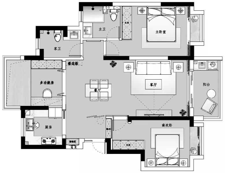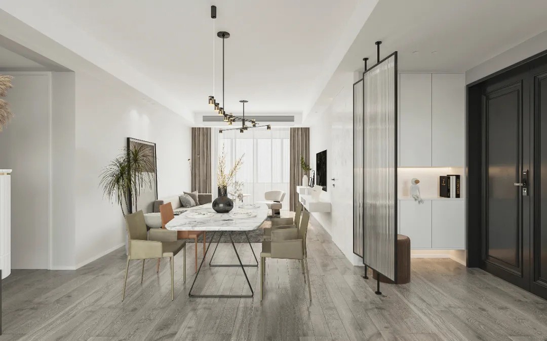 “解”的方式打破了原有昏暗的中軸空間,讓陽光照射到每個角落。“構(gòu)”的方式在材質(zhì)上選擇鑒于“解”與“構(gòu)”兩者之間,選用了玻璃材質(zhì)。材料上利用玻璃、鋼板、木材、亞克力材質(zhì)的不同厚度體量和不同材質(zhì)的質(zhì)地對比反差,給空間層次一種“干凈”、“細(xì)膩”的節(jié)奏感。嘗試著在保留原有空間結(jié)構(gòu)方向的同時,找出新的軸線關(guān)系,運(yùn)用軸線平移的方式使空間功能得到滿足。打破原有中軸空間,運(yùn)用軸線平移方式滿足空間功能