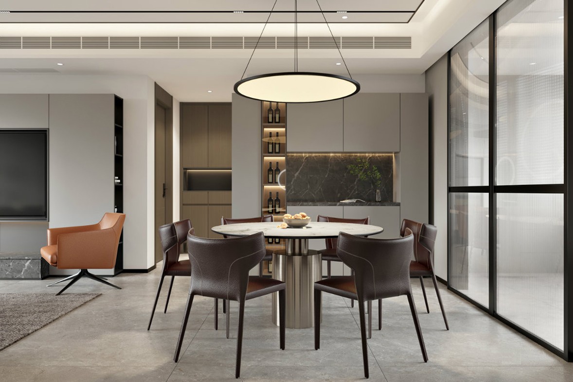 在設(shè)計(jì)開放空間時(shí),采用了精致的家具和干凈的線條。開放的空間給所有的設(shè)計(jì)帶來最大的舒適,不僅滿足日常生活的需要,更體現(xiàn)了藝術(shù)的美學(xué)。客廳的所有空間都不矯揉造作,高度理性地減少了裝飾和色彩的元素,展現(xiàn)出手寫體的美和現(xiàn)代極簡主義的美。設(shè)計(jì)師用簡約卻不簡單的細(xì)節(jié),打造了一個(gè)呈現(xiàn)靈性的住宅空間。室內(nèi)有條不紊的紋理細(xì)節(jié)得到完美的呈現(xiàn),結(jié)合內(nèi)飾的點(diǎn)綴,整體有了趨向完美的比例感,材質(zhì)賦予了整個(gè)空間高級(jí)質(zhì)感的體現(xiàn)。