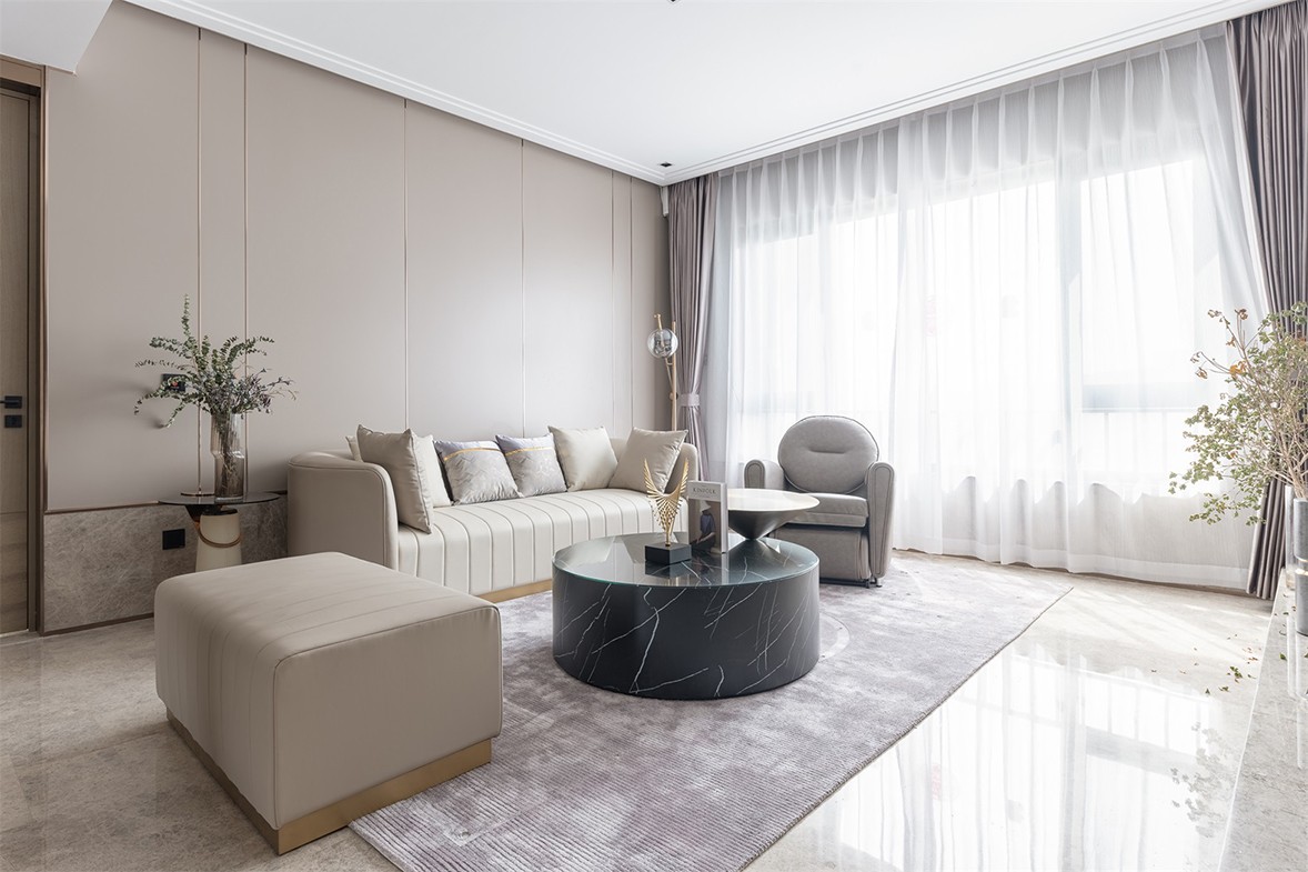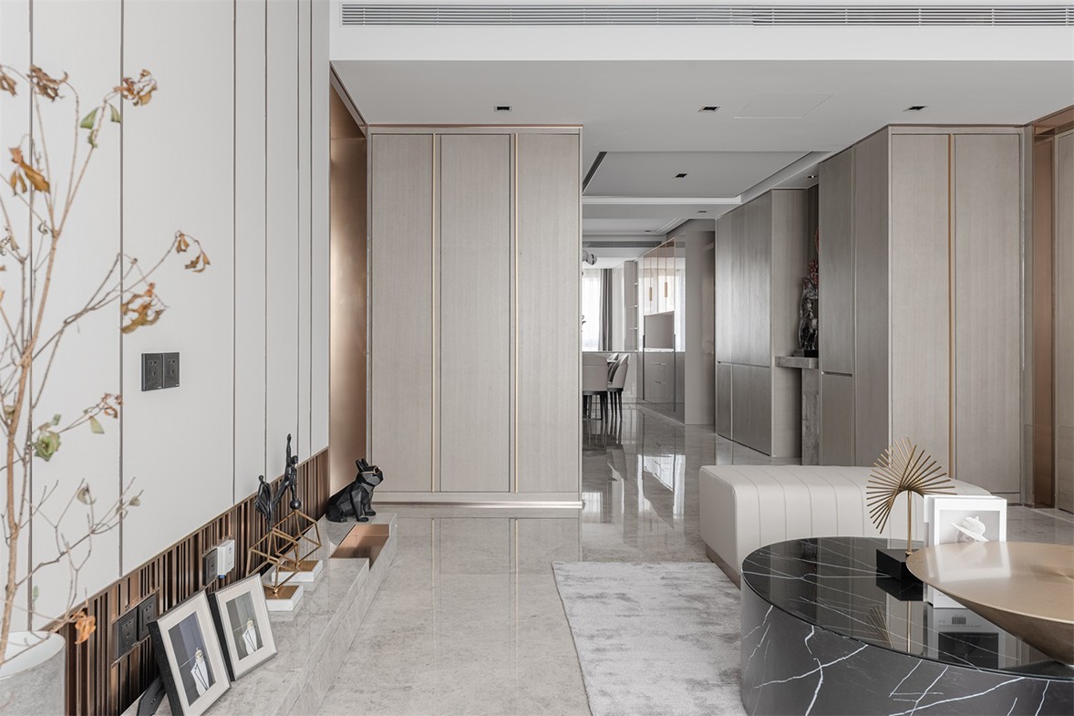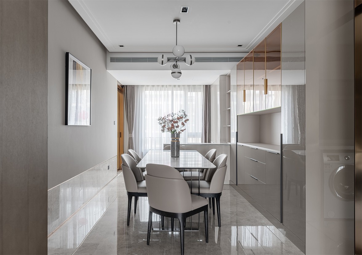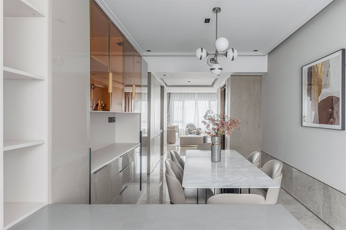 Fully open floor-to-ceiling balcony windows allow sunlight to fall in every corner of the living room. The decoration of green plants gives life full of vitality. The arched shape of the specially customized shoe cabinet is in harmony with the overall style. Weaken the tough lines of the door panel, make it smart and fashionable, and increase the sense of romance. The open kitchen, with an island design, is more convenient for daily use, enriches more life scenes, and increases family interaction. The background of the master bedroom is pink and green, with metallic lines embellished, retro and elegant. The exquisite wall lamp echoes the background shape, blending a delicate and romantic atmosphere into the space.